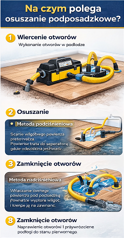 Proces polega na usuwaniu wilgoci z przestrzeni pod posadzką przy pomocy specjalnych urządzeń. Najczęściej wykonuje się niewielkie otwory technologiczne, przez które wtłaczane lub odsysane jest powietrze. Dzięki temu można skutecznie osuszyć warstwy ukryte pod podłogą bez zrywania całej posadzki.